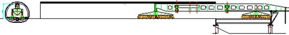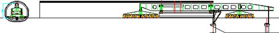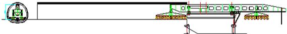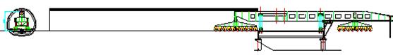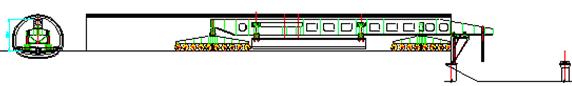 3、操作系統(tǒng)由運輸狀態(tài)轉(zhuǎn)換至喂梁狀態(tài),由后車及主支腿驅(qū)動裝置推動整機前行,當輔助支腿到達待架孔前方橋墩支承位置時停車。在箱梁下面放置臨時支墩,并將箱梁放在臨時支墩上,然后打好輔助支腿。
